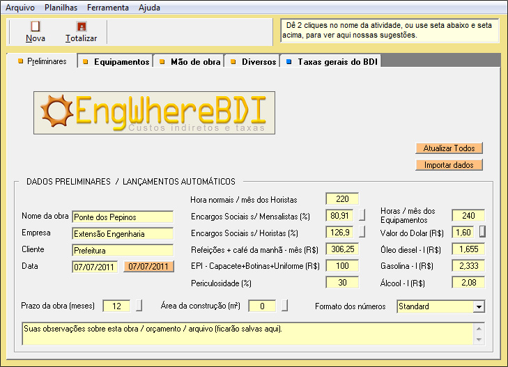- Dispõe de relação completa das despesas indiretas e das taxas do BDI, com dicas, índices e sugestões item a item;